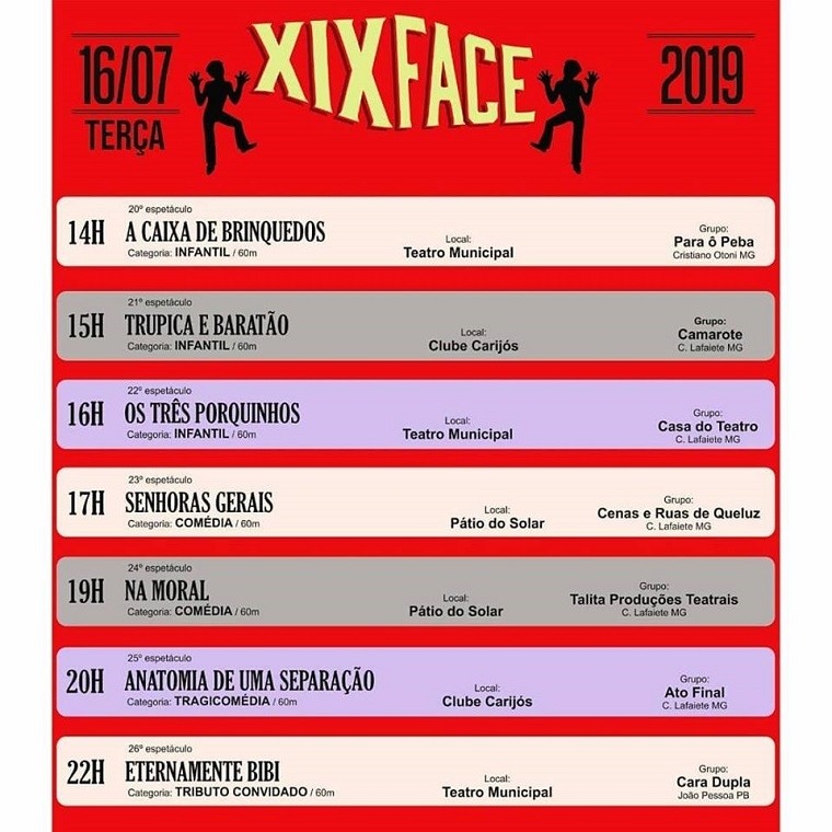 O XIX Festival de Artes Cênicas de Conselheiro Lafaiete (Face) continua a todo vapor. Então, confira a programação dos espetáculos desta terça-feira, dia 16 de julho: