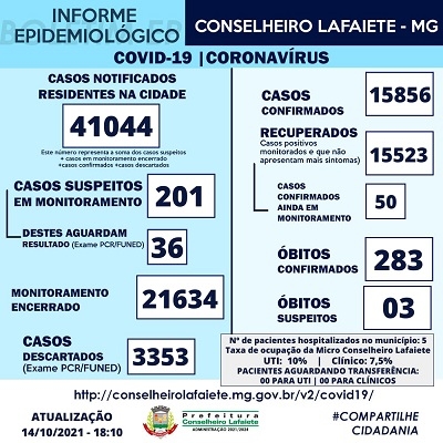 A Secretaria Municipal de Saúde e o Serviço de Epidemiologia confirmam sete novos casos de Covid-19 em Conselheiro Lafaiete, nesta quinta-feira, 14 de outubro. Ao todo, são 15.856 registros de infecções pelo Coronavírus, sendo 15.523 recuperados e 201 quadros suspeitos em monitoramento. São 283 vítimas fatais das complicações da doença. Três óbitos estão em análise.