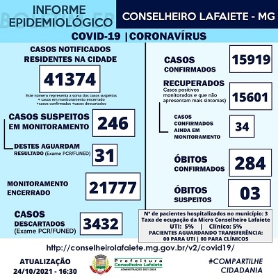 A Secretaria Municipal de Saúde e o Serviço de Epidemiologia não registrou nenhum novo caso de Covid-19 em Conselheiro Lafaiete, neste domingo, 24 de outubro. Ao todo, são 15.919 registros de infecções pelo Coronavírus, sendo 15.601 recuperados e 34 quadros suspeitos em monitoramento. São 284 vítimas fatais das complicações da doença. Três óbitos estão em análise.