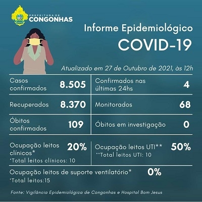 A Secretaria Municipal de Saúde informa que, até às 12h desta quarta-feira, dia 27 de outubro de 2021, 8.505 casos de Covid-19 haviam sido confirmados em Congonhas. Deste total, 8.370 pacientes já receberam alta. Foram confirmados quatro novos casos nas últimas 24 horas e estão sendo monitorados 68 casos da doença.