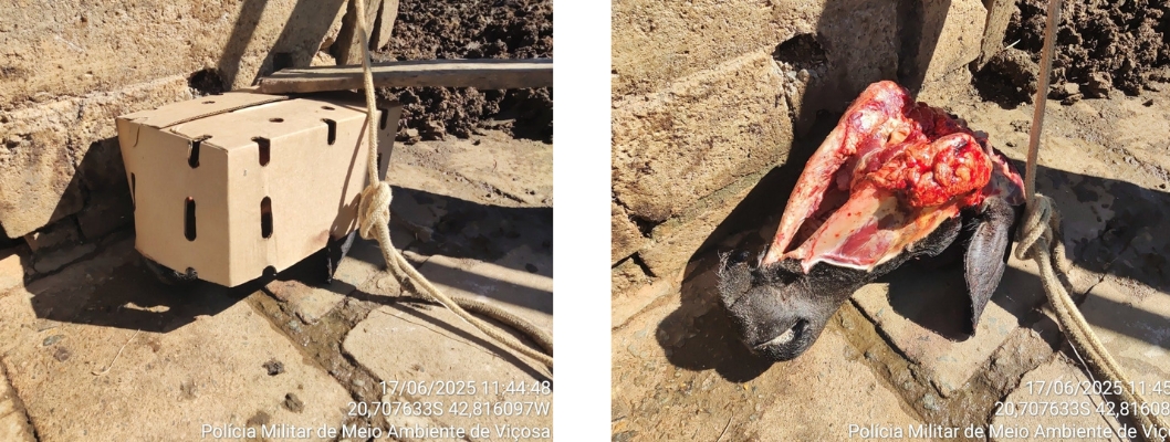 Na última terça-feira, dia 17, a Polícia Militar de Meio Ambiente de Viçosa recebeu uma denúncia anônima da existência de um abatedouro clandestino de bovinos, na localidade de Córrego Santa Tereza, zona rural da cidade. Após deslocamento ao local, foi constatado o abate recente de um boi, cuja cabeça ainda se encontrava na propriedade.