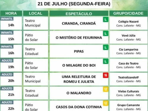 Nesta segunda-feira, dia 21, o festival continua com apresentações voltadas ao público infantil e adulto, ocupando diversos espaços culturais da cidade. A proposta é democratizar o acesso ao teatro e aproximar a comunidade da produção cênica local e regional. O Face também cumpre o papel de valorizar artistas e grupos independentes, fortalecendo a cena cultural de Lafaiete e fomentando o envolvimento da população com as artes.