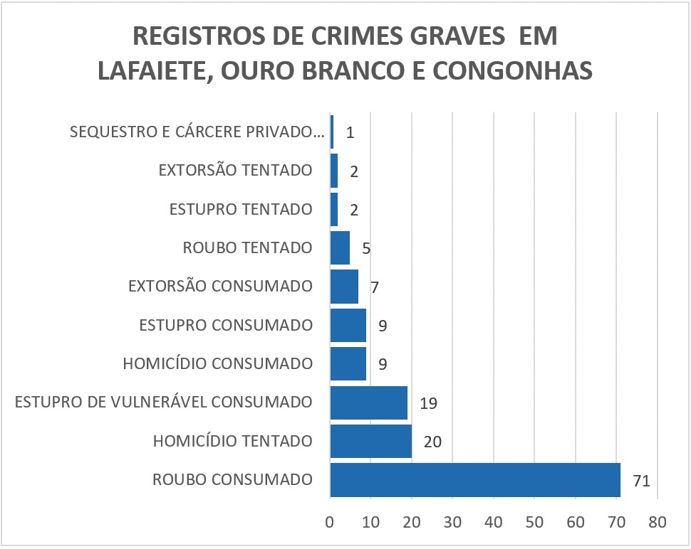Em Lafaiete, município mais populoso do grupo, com 138.946 habitantes (estimativa IBGE 2025), foram contabilizados 73 crimes violentos. O tipo mais frequente foi o roubo consumado, com 44 registros, caracterizado pela subtração de bens mediante violência ou grave ameaça. Em seguida aparecem 7 tentativas de homicídio e 6 homicídios consumados.