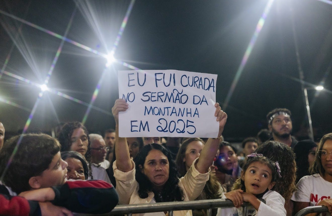 Um dos momentos emocionantes foi o testemunho da fiel Zilma Aparecida dos Santos, de Belo Vale. Ela contou que participou do Sermão da Montanha em 2025 e, desde então, alcançou a cura que tanto buscava.